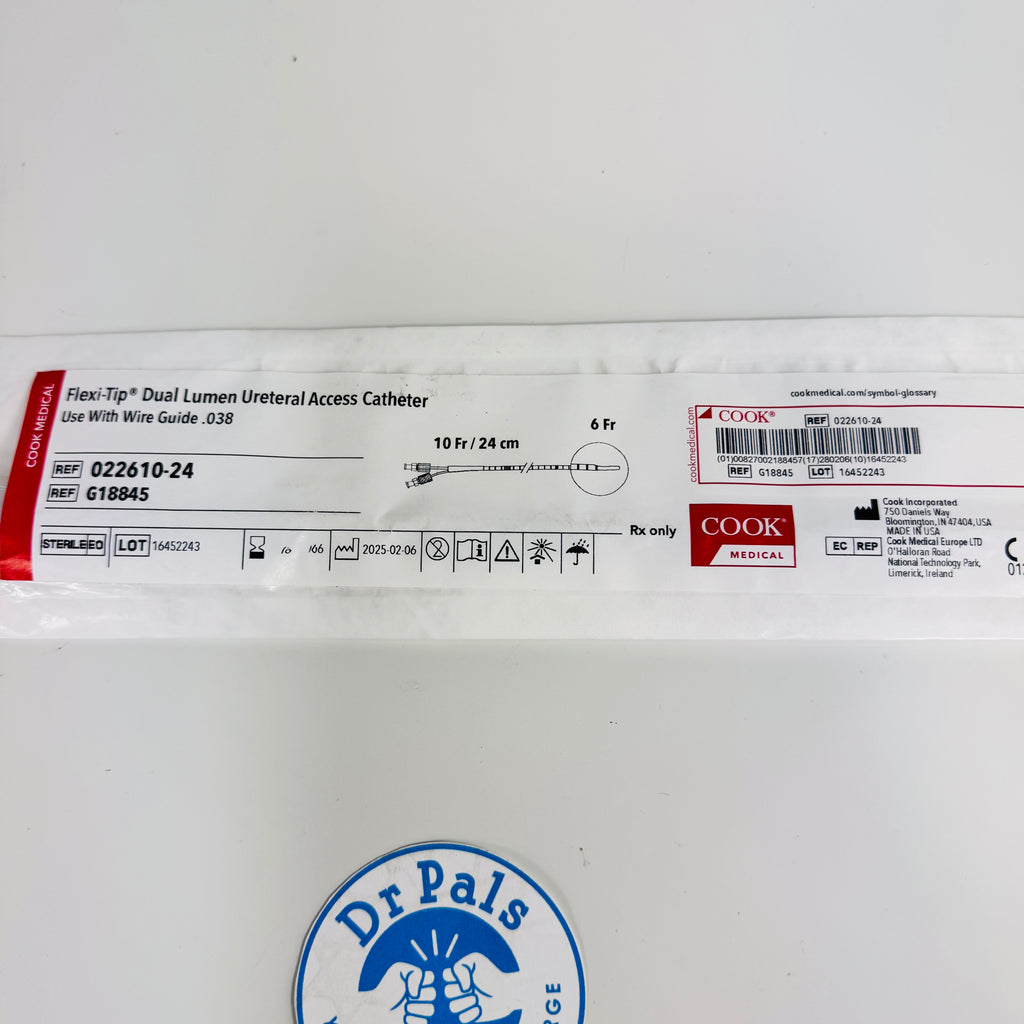 The Cook Medical G18845 Flexi‑Tip Dual Lumen Ureteral Access Catheter is a standard dual‑lumen catheter designed for ureteral access, contrast medium delivery, and placement of a safety guidewire during percutaneous or transurethral procedures. It is a 6/10 Fr (often marketed as 10 Fr) catheter with a 24 cm length and a soft Flexi‑Tip distal configuration to facilitate atraumatic navigation in adult and adolescent ureters, including pediatric patients ≥12 years old. One lumen is dedicated to injection (contrast, irrigation, anesthetic), while the second lumen accommodates a guidewire for secure access and exchange.