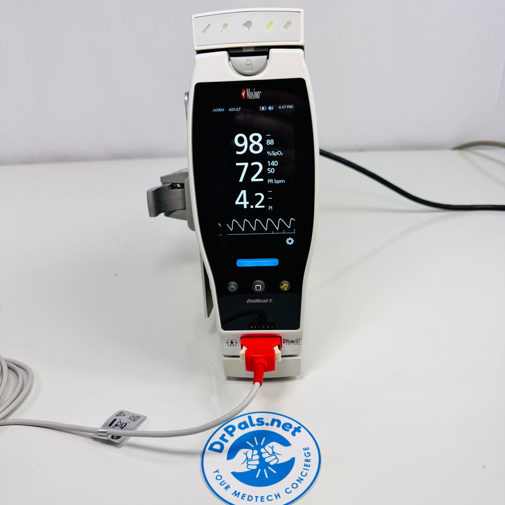The Masimo Radical‑7 is a versatile handheld and docking‑style monitor that provides continuous, noninvasive measurement of oxygen saturation (SpO₂), pulse rate, and perfusion index, with optional Rainbow parameters such as SpHb, SpCO, SpMet, SpOC, PVi, and RRa depending on configuration and sensor choice.