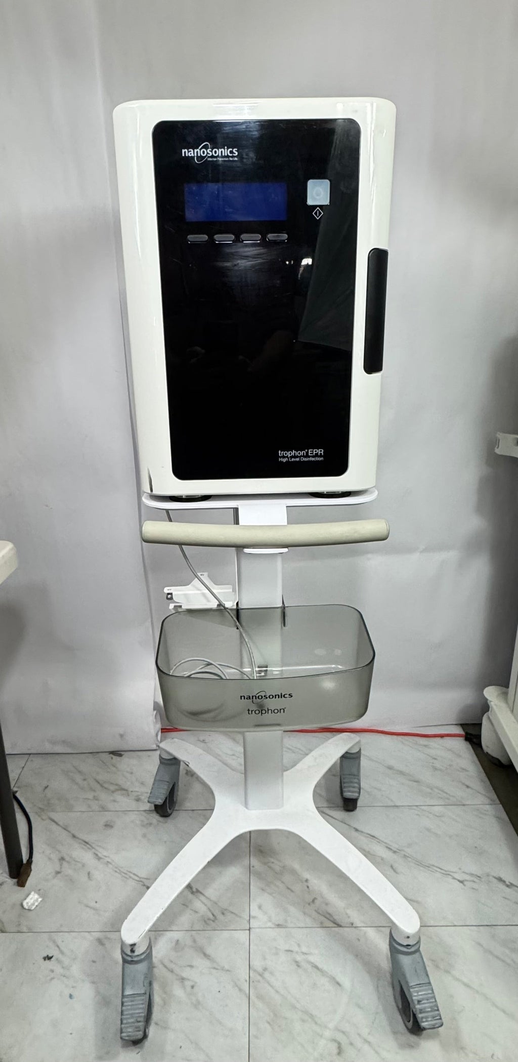 The Nanosonics TROPHON EPR (model N0010 or N00010-US variant) is a compact, automated high-level disinfection system for ultrasound transducers, utilizing sonicated hydrogen peroxide mist (NanoNebulant) in a sealed chamber for a 7-minute cycle that achieves bactericidal, virucidal, mycobacterial, and sporicidal efficacy while disinfecting probe handles and surfaces. It features one-touch operation, real-time validation with chemical indicators, and optional traceability via AcuTrace RFID for compliance in clinical infection prevention.