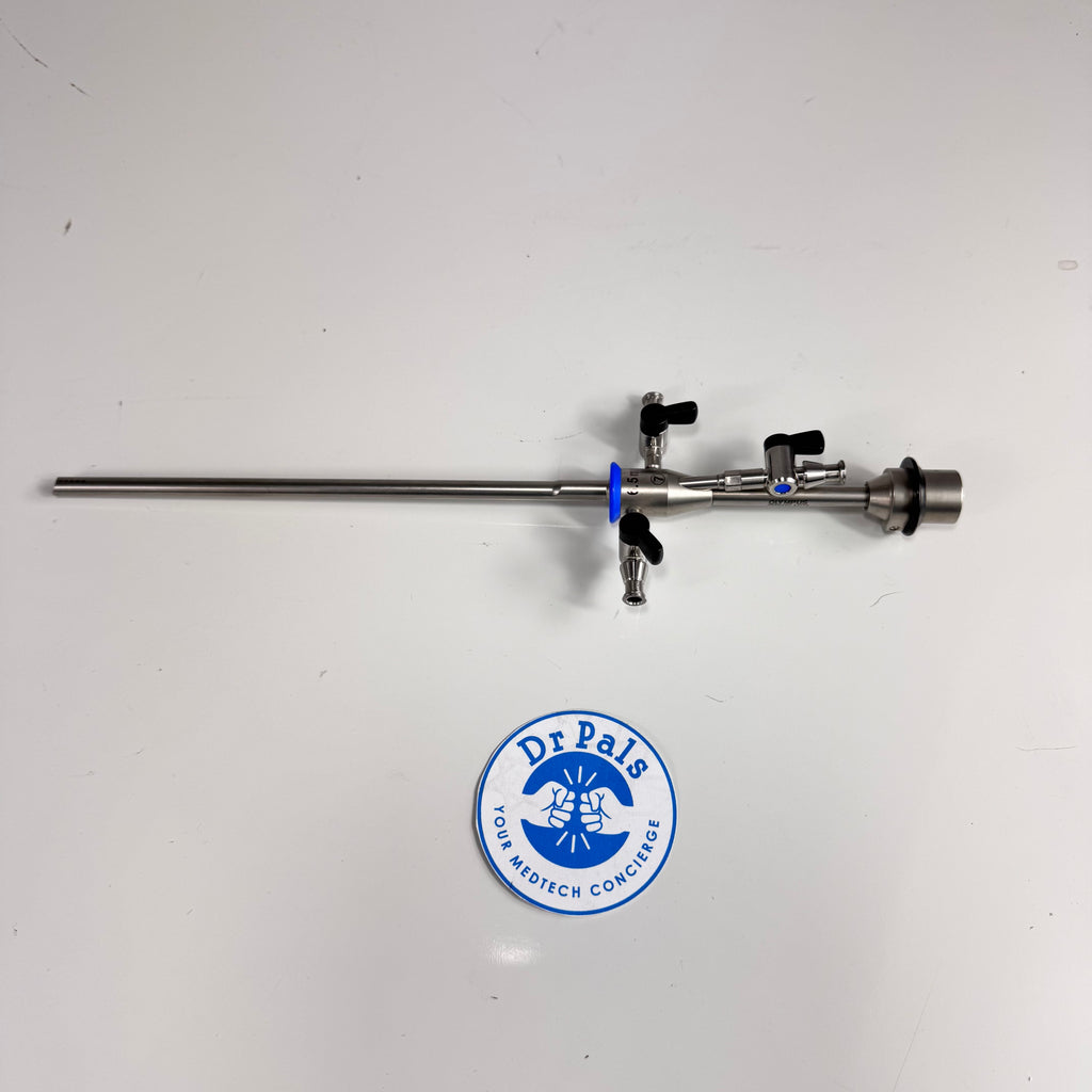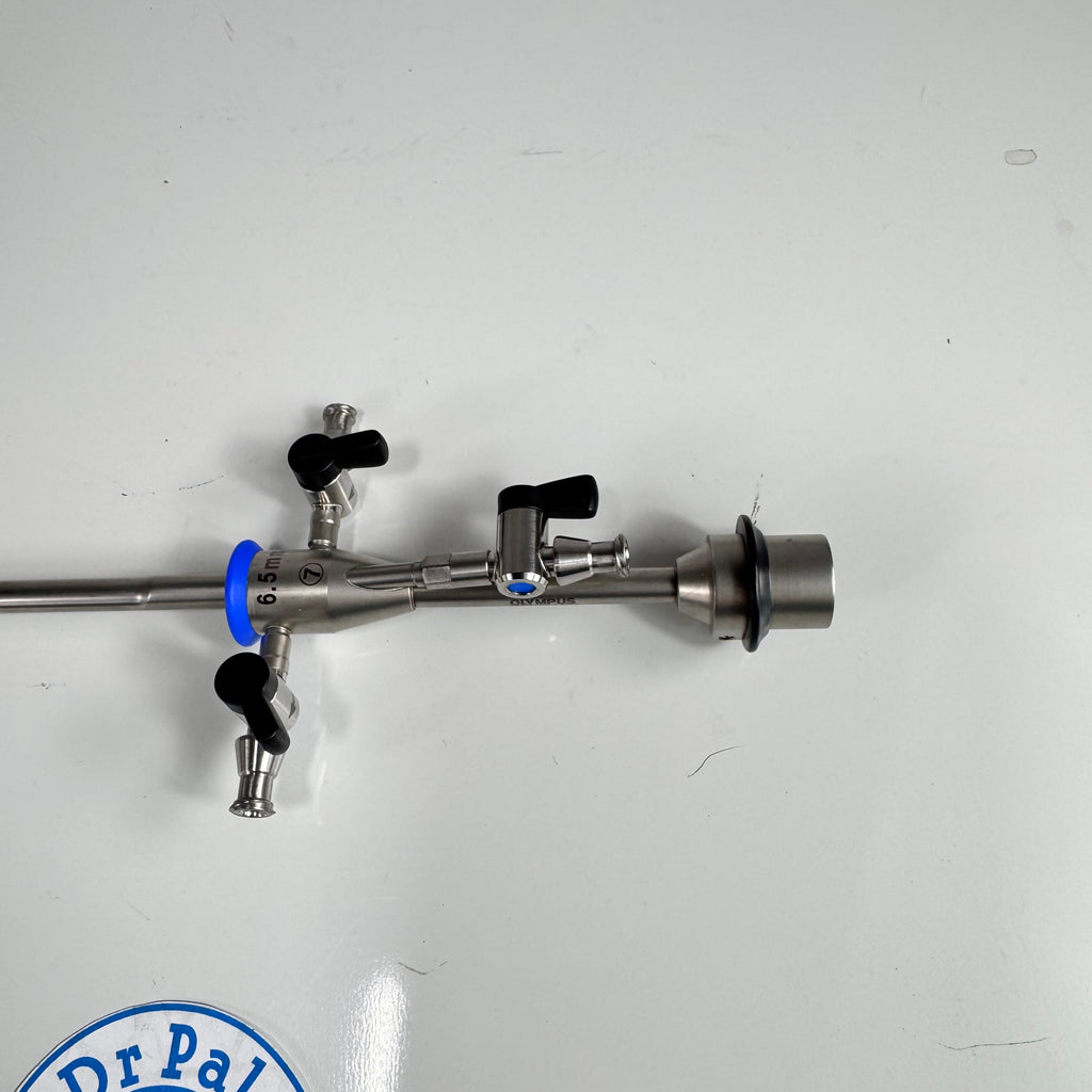 The Olympus A4773 is a 6.5 mm operative hysteroscope sheath designed for therapeutic hysteroscopy, featuring continuous flow irrigation through dual stopcocks and a 7 French instrument channel for larger grasping forceps, scissors, and biopsy tools. With a 185 mm working length, it accommodates Olympus 3 mm hysteroscopes (0°/12°/30°) and supports advanced gynecologic procedures including polyp resection, myomectomy, and intrauterine adhesiolysis while maintaining optimal uterine distension and visualization.