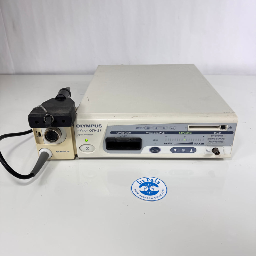 The Olympus OTV-S7 is a digital video processor and camera control unit from the VISERA endoscopy system, designed for high-quality endoscopic imaging in gastrointestinal, urology, bronchoscopy, and surgical applications. It processes signals from Olympus camera heads and videoscope CCDs, delivering NTSC/PAL composite, Y/C, RGB, and digital outputs with features like automatic white balance, exposure control, image enhancement, and PC card image storage. Compact and versatile, it supports advanced functions such as picture-in-picture, multi-freeze, and patient data overlay for efficient clinical workflows.