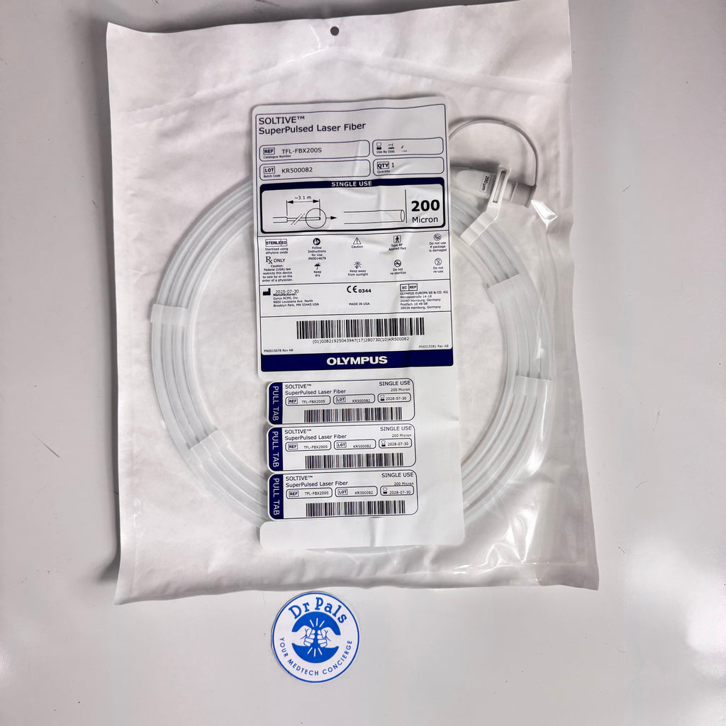 The Olympus TFL-FBX200S is a 200-micron SOLTIVE SuperPulsed thulium fiber laser fiber designed for high-performance urologic lithotripsy and soft-tissue applications. This sterile, single-use surgical fiber is optimized for use with the SOLTIVE SuperPulsed Laser System, providing efficient stone dusting, fragmentation, and precise soft-tissue cutting with reduced retropulsion and minimal fiber burn-back. Its small core diameter and flexible construction support excellent scope deflection and access to challenging anatomy while maintaining high power delivery for fast, effective treatment.