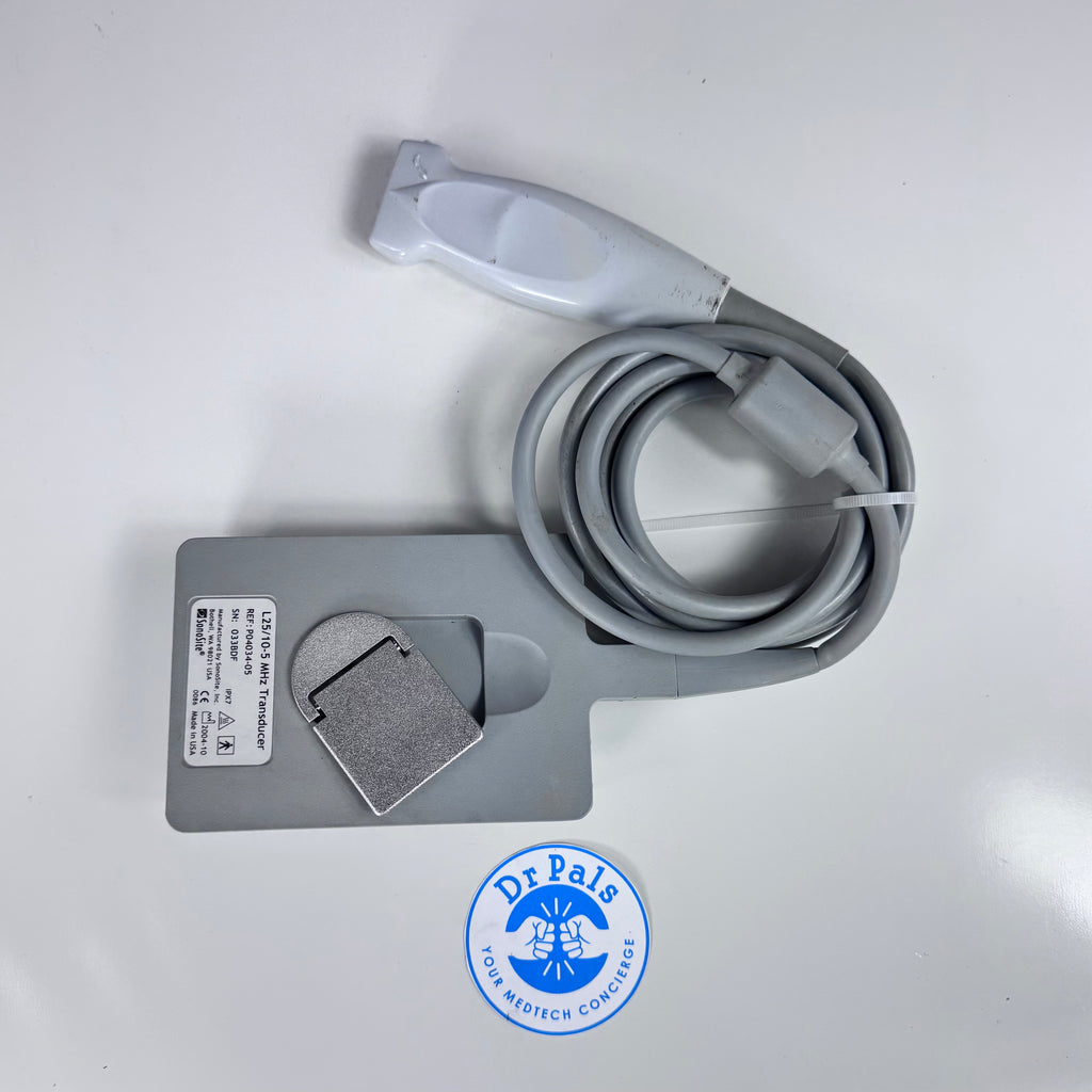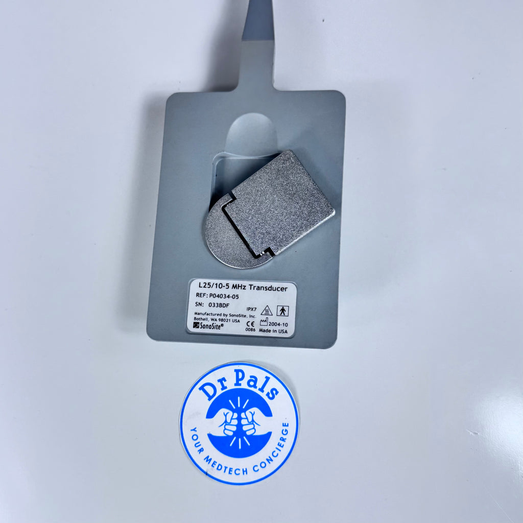 The SonoSite P04034-05 (L25) is a high-frequency linear array ultrasound transducer designed for detailed imaging of superficial structures. It operates over a frequency range of 10-5 MHz, giving high-resolution images suitable for breast, musculoskeletal (MSK), nerve, vascular, and small parts examinations. The probe offers a scan depth of approximately 6 cm, making it ideal for shallow to intermediate-depth imaging. Its broadband linear array technology enables clear visualization and fine resolution of soft tissue structures, supporting accurate diagnostics and guided procedures such as biopsies and vascular access.