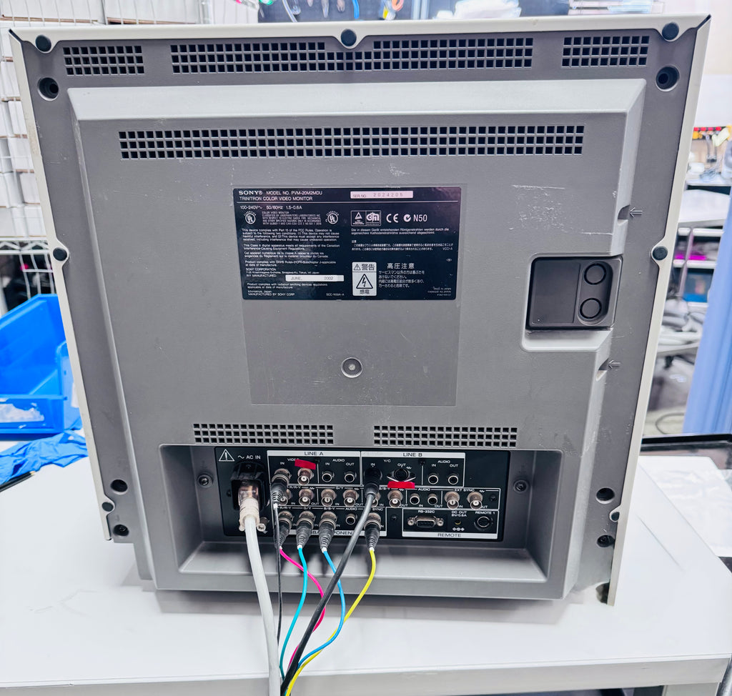 The Sony Trinitron PVM-20M2MDU is a professional-grade CRT color video monitor engineered for medical and broadcast use. Equipped with Sony’s high-resolution Trinitron tube, it delivers crisp images at 600 TV lines of resolution. The 20-inch unit (19-inch viewable area) supports multiple analog inputs—composite, S-Video, component (YPbPr), and RGB—and automatically detects NTSC or PAL color systems. Featuring robust metal construction, underscan/overscan modes, RS-232C remote control capability, and automatic degaussing, the PVM-20M2MDU remains one of the most reliable CRT displays used in surgical visualization and video signal analysis.