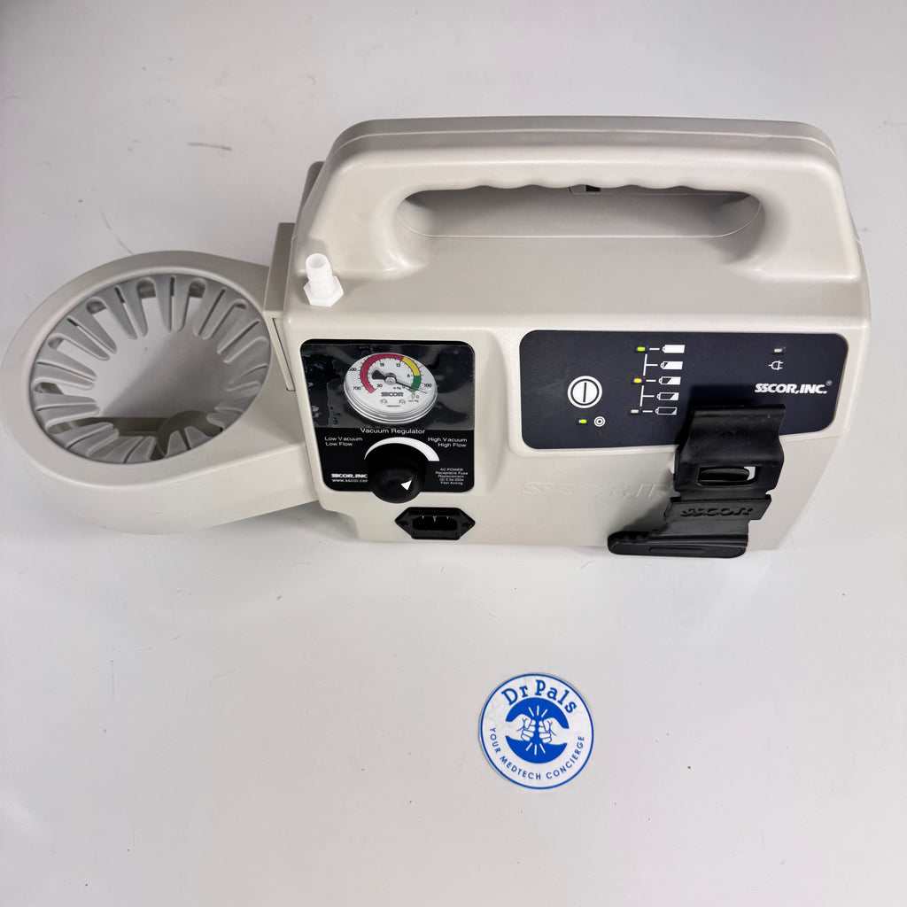 The SSCOR 2314 Duet is a portable AC suction unit with internal battery backup, providing powerful, adjustable medical vacuum for airway clearing and procedural suction in hospital and transport settings. It delivers more than 30 LPM airflow at the patient tubing and a fully adjustable vacuum range from below 50 mmHg up to over 525 mmHg, allowing safe use for neonates, pediatrics, and adults. The unit includes an internal dual-mode charger, sealed lead-acid battery with about 45 minutes runtime at full charge, and is available in configurations compatible with Bemis, Medline, or Cardinal canisters.