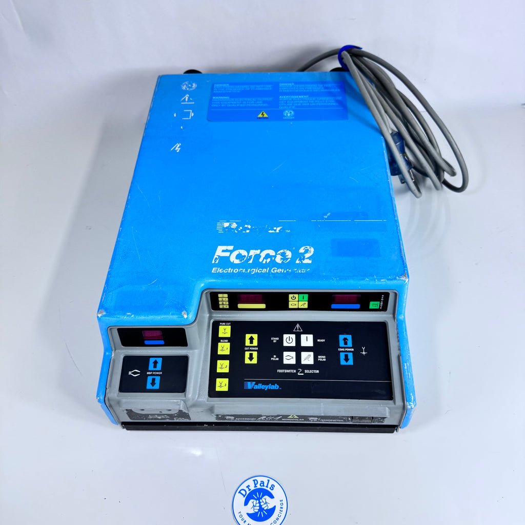 The ValleyLab Force 2-2PCH electrosurgical generator is a reliable, versatile surgical device providing high-performance cutting and coagulation capabilities in both monopolar and bipolar modes. Designed for precision and safety, it features a 300-watt output, audible and visual alarms including the REM™ (Return Electrode Monitoring) fault indicator for patient safety. The unit supports multiple waveform outputs and operates efficiently through a convection cooling system without a fan. Ideal for various surgical procedures, this generator includes a monopolar foot switch with optional bipolar foot switch and rolling cart accessories.